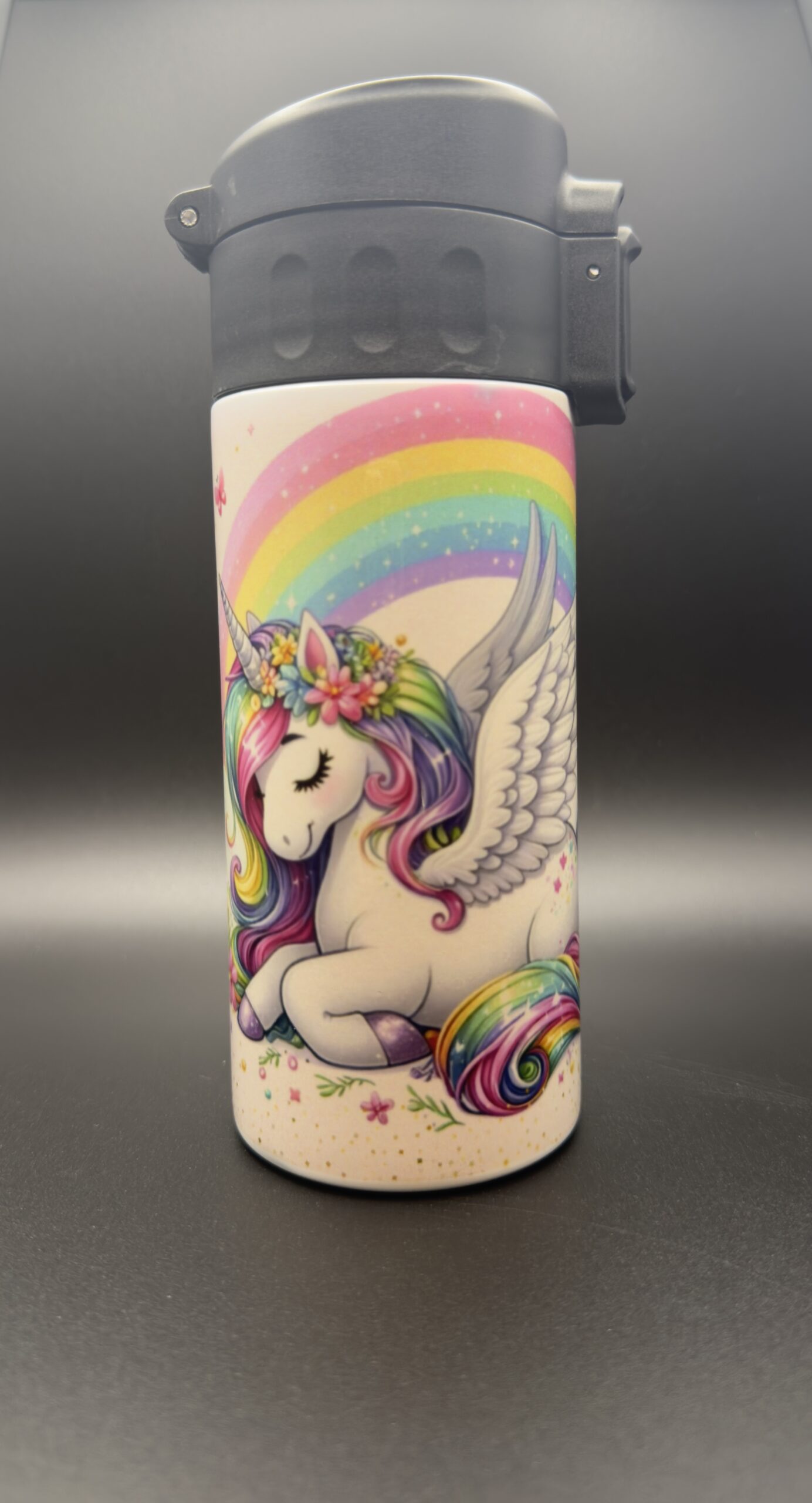 Inclus: Gourde, couvercle encliquetante en plastique transparent avec rabat d’ouverture coulissant, paille, brosse et fond en caoutchouc antidérapant
